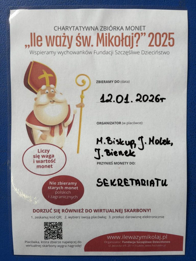 Zbieramy monety do 12 stycznia 2026 r. – można je przynosić do sekretariatu szkoły.