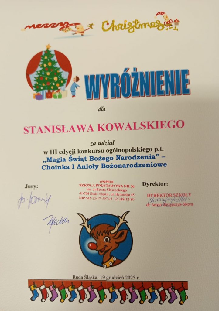Uczniowie klasy 3a wykonali pod kierunkiem wychowawcy Marioli Kugenbuch prace plastyczne na ogólnopolski konkurs ,,Magia Świąt Bożego Narodzenia. Choinka i Anioły Bożonarodzeniowe”, organizowany przez Szkołę Podstawową nr 36 z Orzegowa.