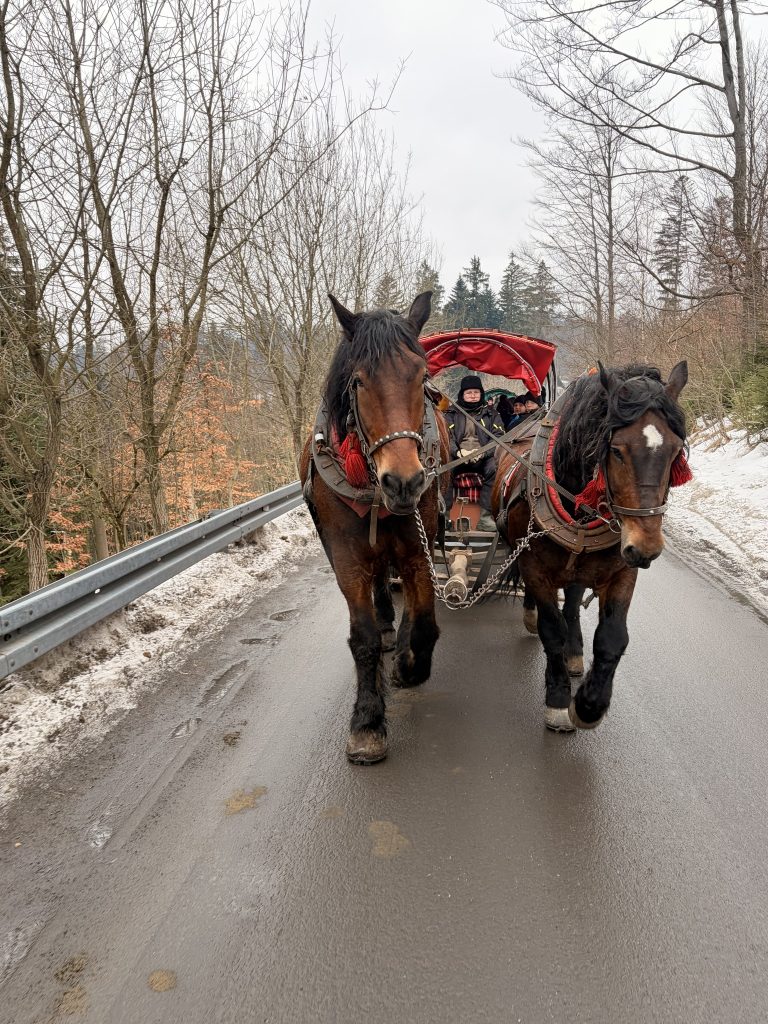 Zimowy kulig przez malownicze trasy Kubalonki wprowadził uczniów klas IV b, VI a i VI b w atmosferę zbliżających się ferii. Radosne śmiechy szczęśliwych dzieci, dźwięki dzwonków i stukot kopyt niosły echem się po lesie. Szczególny zachwyt wzbudzały konie – spokojne, silne i piękne, a bliski kontakt z nimi, możliwość pogłaskania i powąchania były dodatkową atrakcją. Po mroźnej przejażdżce był czas gorącą herbatkę i pyszne kiełbaski z ogniska w góralskiej Kolybie.
